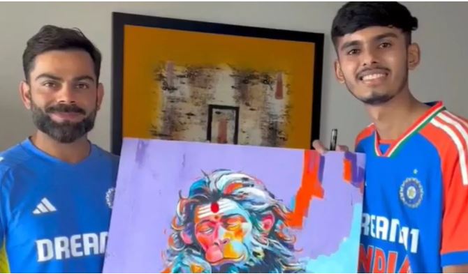कोहली का ये फैन खुद पेंटर है और उसने अपने हाथ से हनुमान जी की एक तस्वीर बनाकर कोहली को गिफ्ट की है। ये फैन कोहली के मुंबई में उनके होटल के कमरे में मिलने पहुंच गया। कोहली ने भी इस फैन को मना नहीं किया और बात मानते हुए उनसा मुलाकात की। कोहली हनुमान जी की तस्वीर देख काफी खुश नजर आए। इसके बाद कुछ देर दोनों ने बात की। फैन अपने हाथ में एक छोटा बैट भी लिए हुए जिस पर उन्होंने कोहली के ऑटोग्राफ भी लिए।