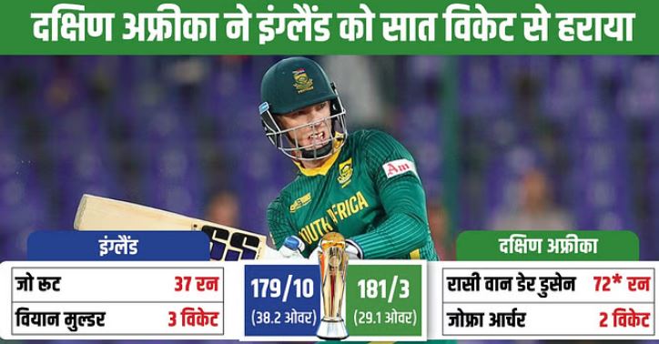 हेनरिक क्लासेन और रासी वान डेर डुसेन की अर्धशतकीय पारियों की मदद से दक्षिण अफ्रीका ने इंग्लैंड को चैंपियंस ट्रॉफी के ग्रुप बी मुकाबले में सात विकेट से हराया। यह चैंपियंस ट्रॉफी इतिहास में विकेट के आधार पर दक्षिण अफ्रीका की तीसरी बड़ी जीत है। इंग्लैंड ने इस मैच में टॉस जीतकर पहले बल्लेबाजी करने का फैसला लिया, लेकिन मार्को यानसेन और वियान मुल्डर की अगुआई में गेंदबाजों के शानदार प्रदर्शन से दक्षिण अफ्रीका ने इंग्लैंड को 38.2 ओवर में 179 रन पर ऑलआउट कर दिया। जवाब में दक्षिण अफ्रीका ने 29.1 ओवर में तीन विकेट पर 183 रन बनाकर मैच जीत लिया।