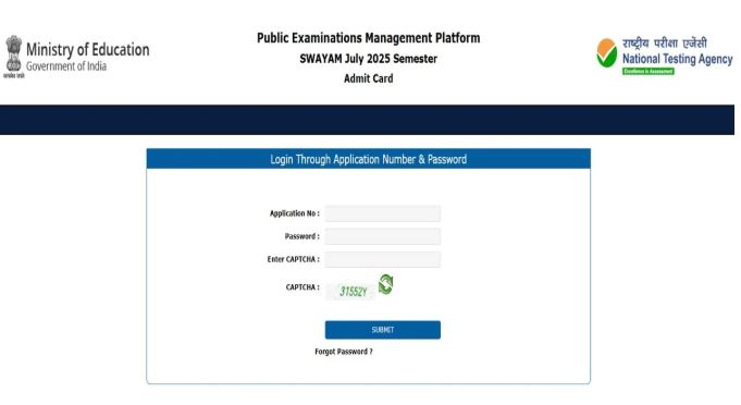 नेशनल टेस्टिंग एजेंसी (NTA) ने स्टडी वेब्स ऑफ एक्टिव लर्निंग फॉर यंग एस्पायरिंग माइंड्स (SWAYAM) जुलाई सेशन परीक्षा के लिए एडमिट कार्ड जारी कर दिए हैं। जो उम्मीदवार एनटीए स्वयं जुलाई सेशन की परीक्षा में शामिल होने वाले हैं और जिन्हें एडमिट कार्ड का बेसब्री से इंतजार था। अब वे ऑफिशियल वेबसाइट exams.nta.nic.in/swayam पर जाकर (NTA SWAYAM July Session 2025) परीक्षा के लिए एडमिट कार्ड डाउनलोड कर सकते हैं। एडमिट कार्ड डाउनलोड करने के लिए उम्मीदवारों को एप्लीकेशन नंबर, पावसवर्ड और कैप्चा कोड को दर्ज करना होगा।