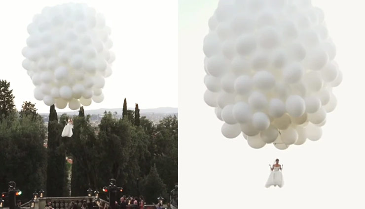 इस वायरल वीडियो में आप देख सकते है कि एक दुल्हन को गुब्बारों की मदद से इटली के फ्लोरेंस में अपने वेडिंग वेन्यू के ऊपर उड़ते हुए देखा जा सकता है। दुल्हन ने एक सुंदर ऑफ-शोल्डर डोल्से और गबाना सफेद शादी की पोशाक और हीरे से जड़ा हुआ टियारा पहना हुआ है। वह 250 सफेद रंग के हीलियम गुब्बारों के झूले पर बैठकर वेडिंग वेन्यू में एंट्री करती है। दुल्हन को हवा में उड़े हुए देखकर शादी में आए मेहमान बेहद हैरान रह गए। दुल्हन ने मेहमानों की तरफ देखकर हाथ हिलाया और एंट्री के वक्त तालियों की गड़गड़ाहट सुनाई दी।