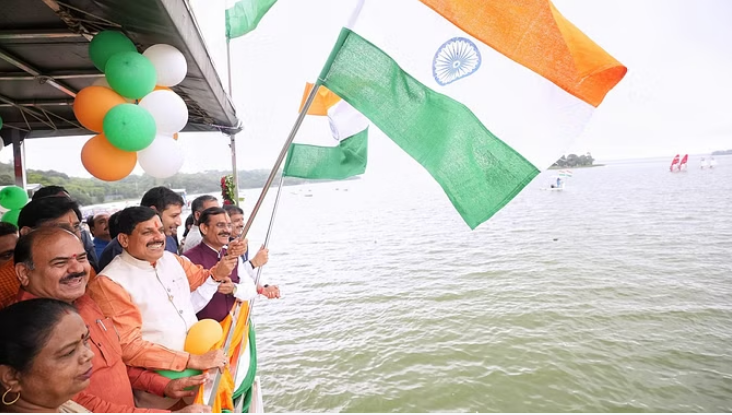 मुख्यमंत्री डॉ मोहन यादव ने वॉटर स्पोर्ट्स तिरंगा शो के अंतर्गत बड़े तालाब पर लेक प्रिंसेस क्रूज में ध्वज अभिवादन किया और तिरंगे की थीम बैलून छोड़े। वॉटर स्पोर्ट्स खिलाड़ियों द्वारा बड़े तालाब में देश भक्ति की धुनों के बीच तिरंगे के साथ विशेष फॉर्मेशन निर्मित की गई। मुख्यमंत्री डॉ यादव ने पूरे जोश के साथ देशभक्ति गीत ‘यह देश है वीर जवानों का’ गाया और बड़े तालाब में नावों पर सवार नृतक और नृत्यांगनाओं ने गीत की धुन पर नृत्य प्रस्तुत किया।