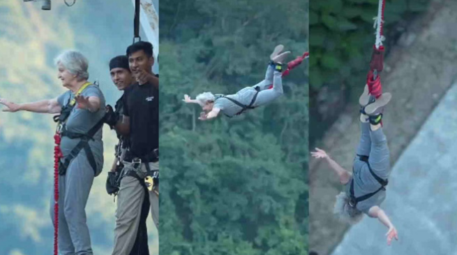ब्रिटेन की 83 वर्षीय ओलेना बायको शिव पुरी क्षेत्र के एक बंजी जंपिंग केंद्र में बंजी जंपिंग करती हुई दिखाई दे रही हैं। उन्होंने 117 मीटर की ऊंचाई से कूद मारी।