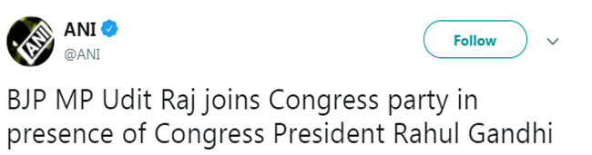 लोकसभा चुनाव-2019 के तहत होने वाले चुनाव के मद्देनजर टिकट कटने से नाराज उत्तर पश्चिमी दिल्ली लोकसभा सीट से भारतीय जनता पार्टी के सांसद उदित राज ने बगावत की राह पकड़ ली है और उन्होंने बुधवार को भाजपा को बाय-बाय कह दिया। टिकट कटने के 24 घंटे के भीतर बुधवार सुबह उदित राज ने कांग्रेस मुख्यालय में अध्यक्ष राहुल गांधी की उपस्थिति में कांग्रेस की सदस्यता ग्रहण कर ली।